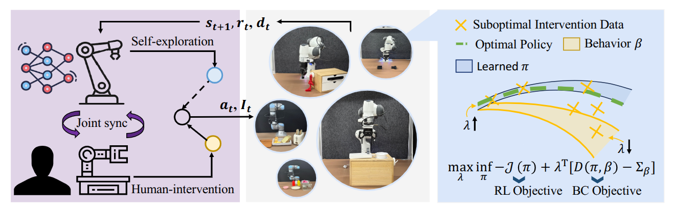In this work, we propose SiLRI, a State-wise Lagrangian Reinforcement learning framework from suboptimal Interventions for real-world robot manipulation training. Fig. 2 provides an overview of SiLRI. Unlike prior real-world RL methods that assume optimal human interventions, SiLRI defines a constrained RL optimization problem, where the constraint bound at each state is determined by the corresponding human uncertainty. In states where humans provide consistent data (low entropy), the learned policy is constrained to stay close to the human policy, improving training efficiency. In high-entropy states, the constraint is relaxed, encouraging the policy to be optimized primarily through its own estimated critic, i.e., RL objective. To solve this constrained RL problem, we introduce learnable state-wise Lagrange multipliers and cast the optimization as a min-max problem, allowing the agent to adaptively trade off between RL and IL objectives.